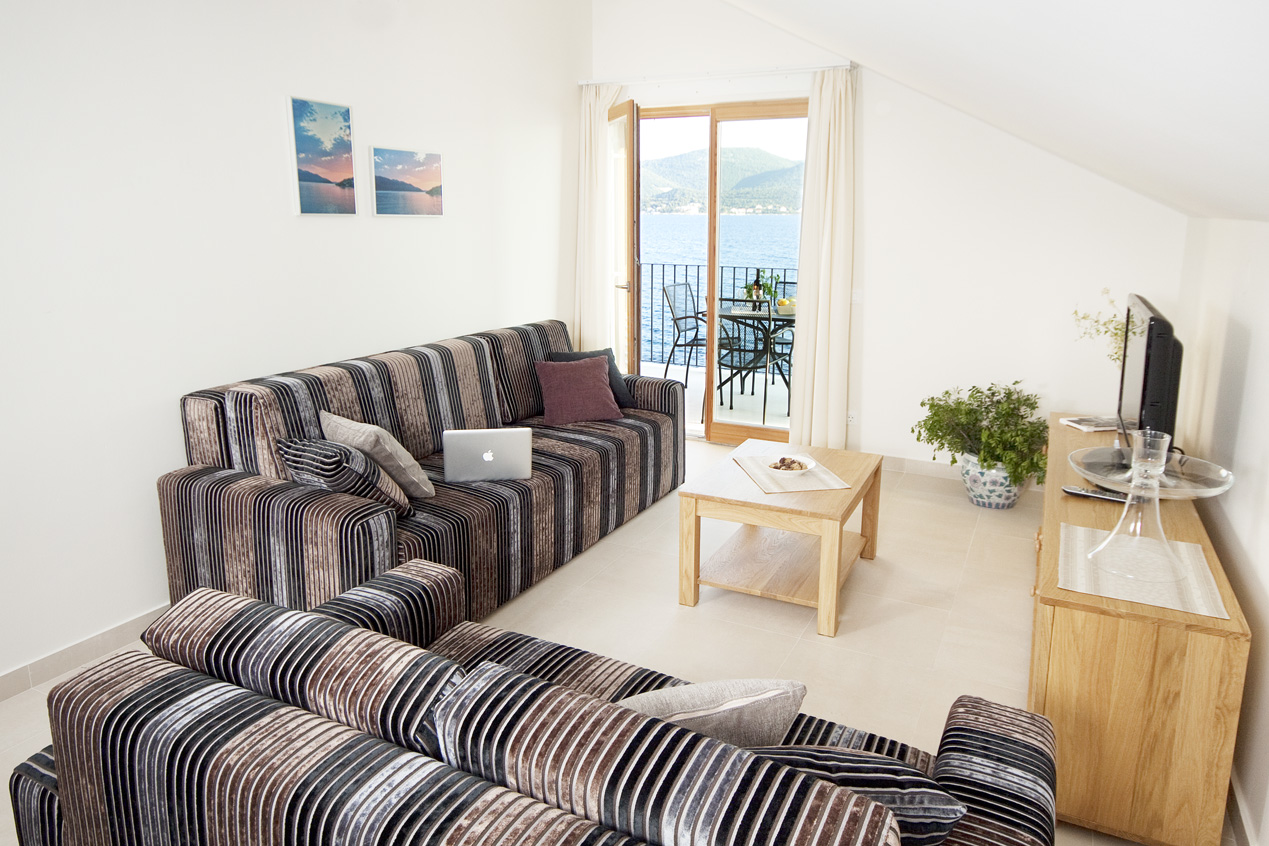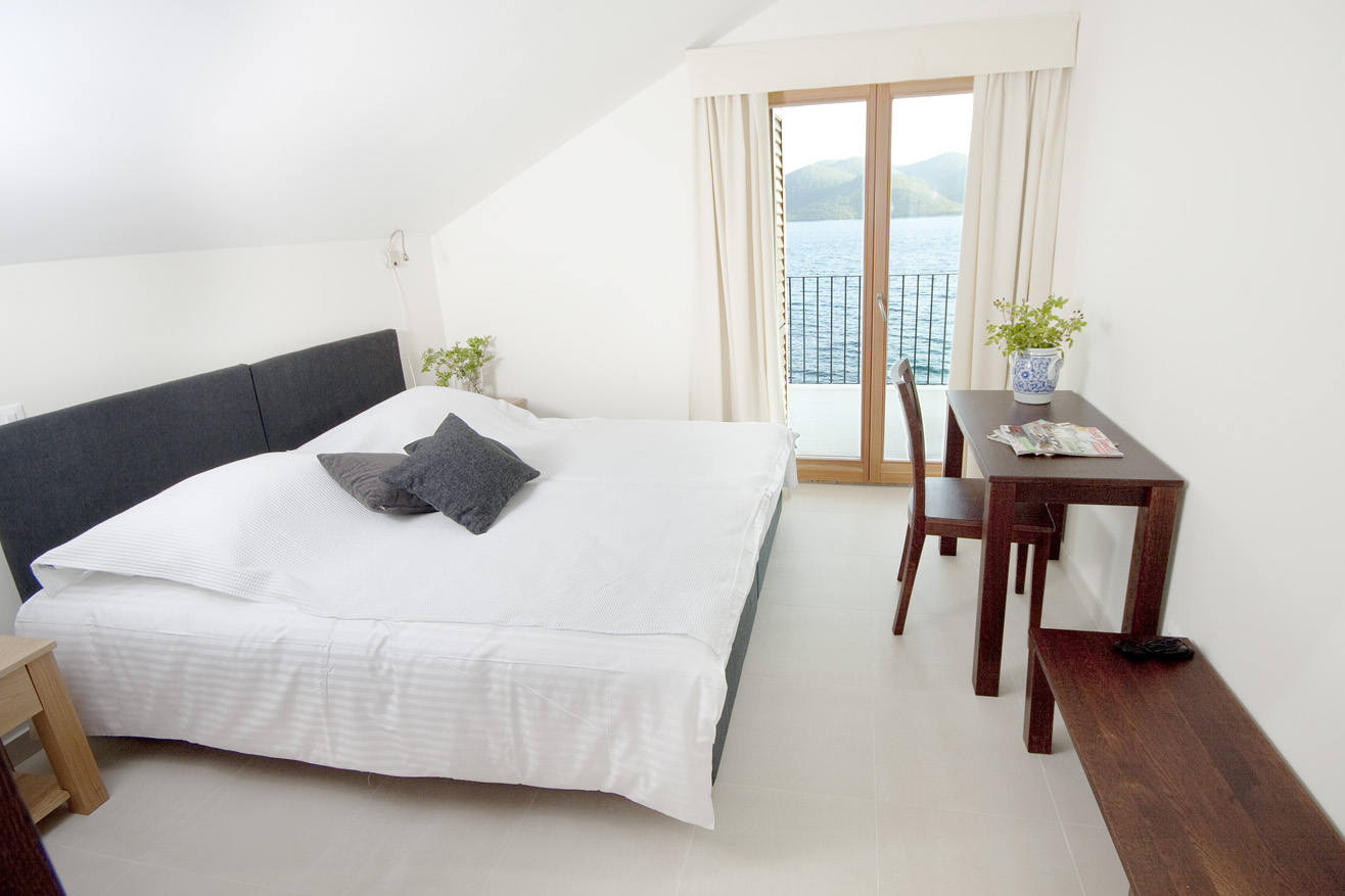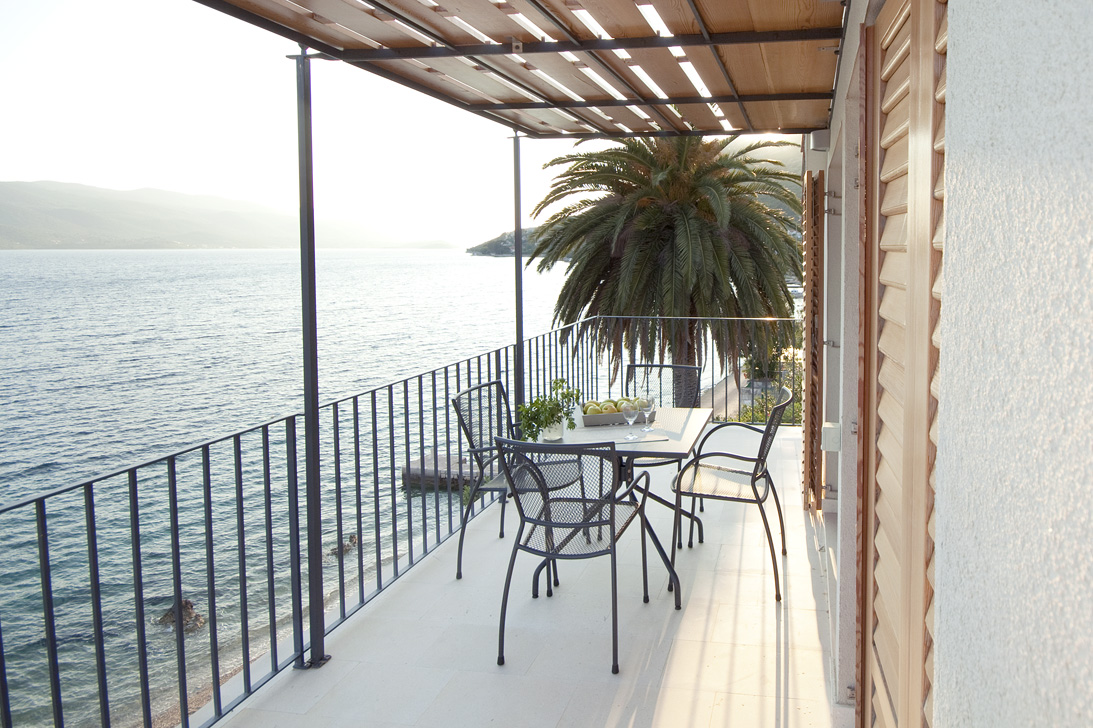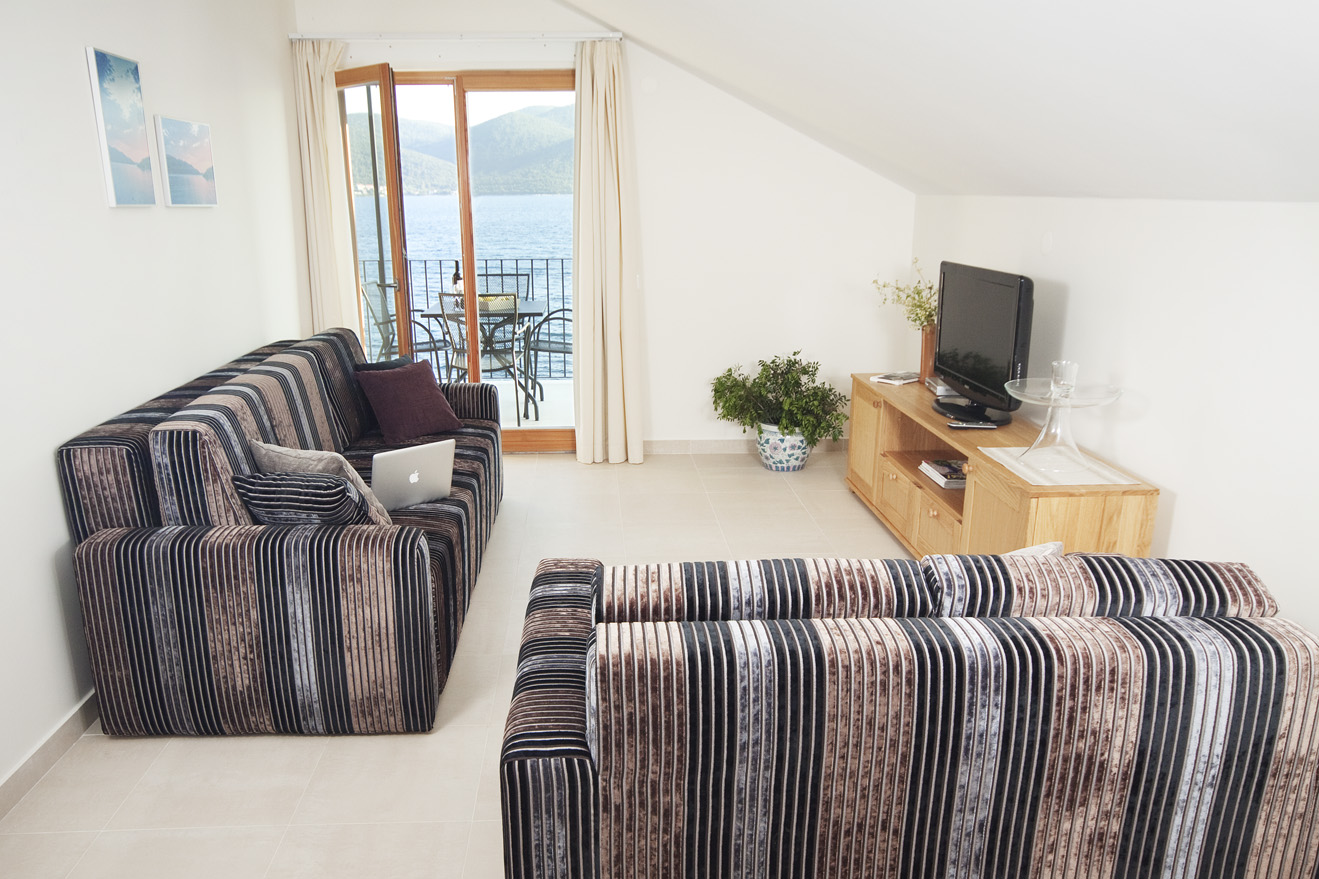 The living room and bedroom have access to the shaded terrace, with a view of the sea and the island of Korčula. The living room is equipped with an LCD TV with satellite channels and a comfortable sofa bed. The sofa bed provides an extra bed so the apartment can accommodate up to 3 persons. The kitchen is fully equipped with a microwave, ceramic hob, dishwasher, refrigerator and granite worktop. All the furniture is custom-made from Slavonian oak. All the furniture is custom-made from Slavonian oak. The double bed has top quality mattresses with aloe vera and high headboards. The terrace furniture is made of wrought steel. The apartment has air conditioning, and under-floor heating.