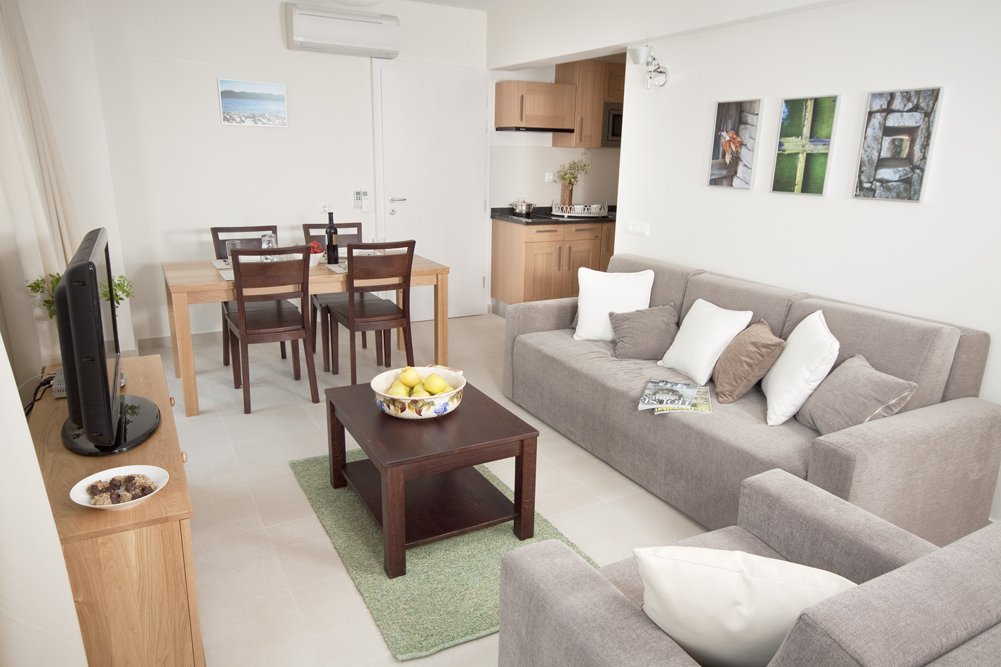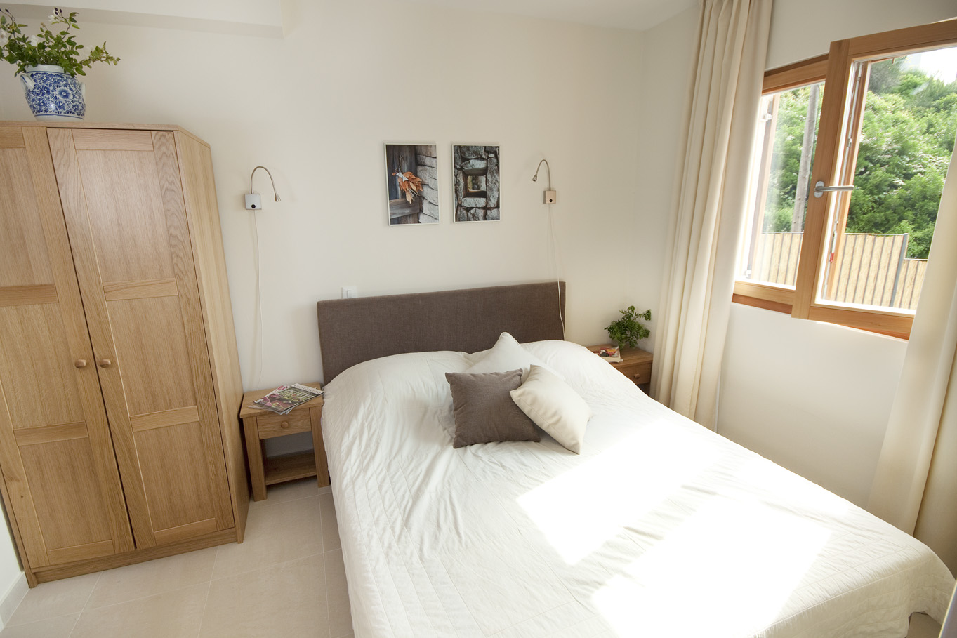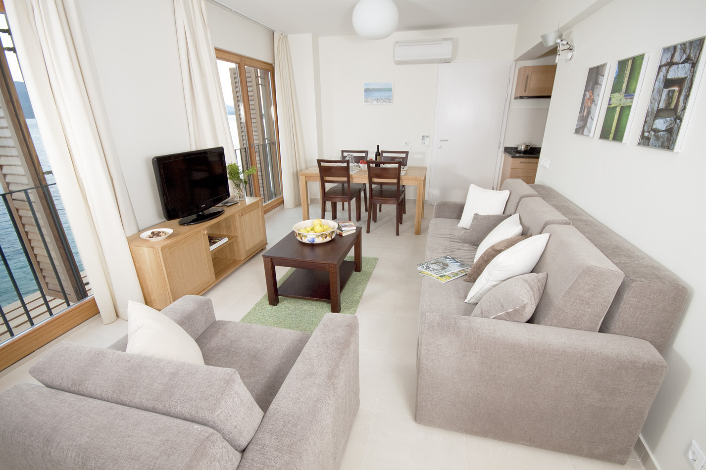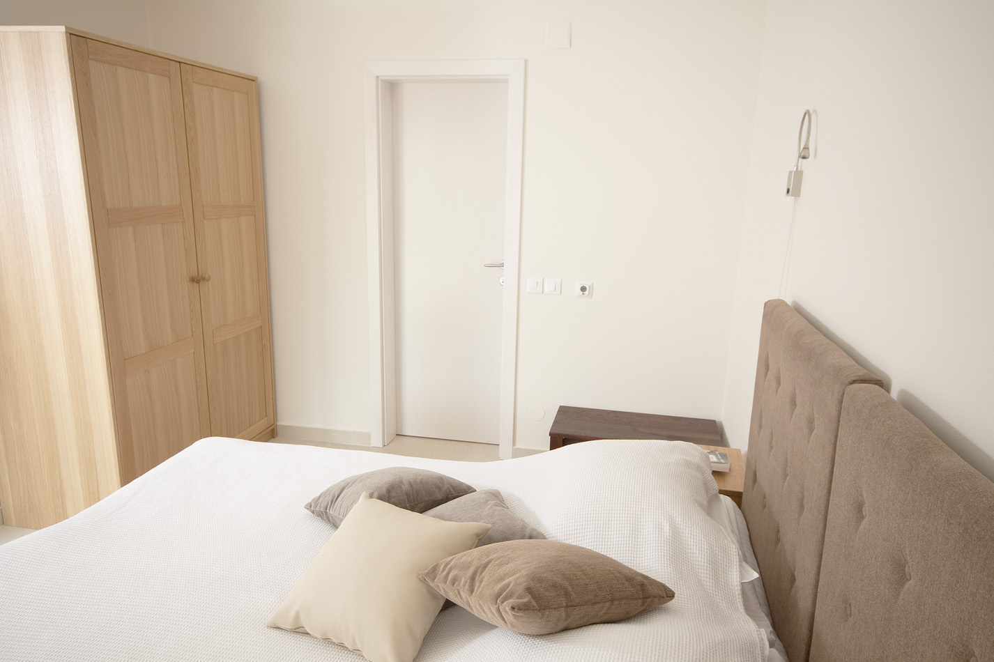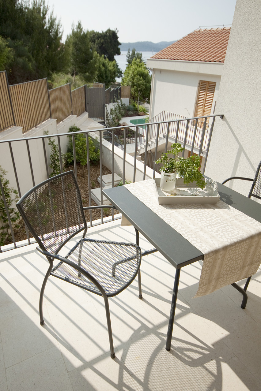 The living room has two large French windows with a view of the sea and the island of Korčula. The living room is equipped with an LCD TV with satellite channels and a comfortable sofa bed. The sofa bed provides an extra bed so the apartment can accomodate up to 5 persons. From the bigger room you have access to a small covered terrace with a view of the pool for a romantic atmosphere. The kitchen is fully equipped with a microwave, ceramic cookstove, dishwasher, refrigerator and granite worktop. All the furniture is custom-made from Slavonian oak. Beds have top quality mattresses with aloe vera and high headboards. The terrace furniture is made of wrought steel. The apartment has air conditioning and under-floor heating.