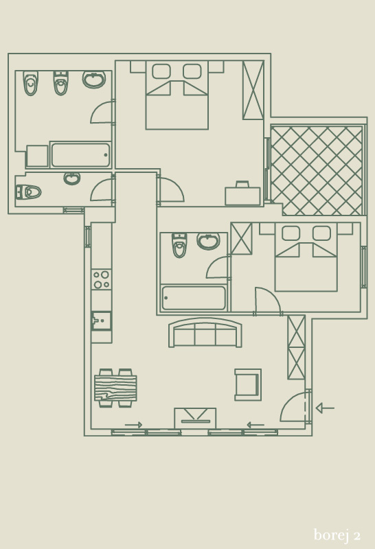 This spacious apartment consists of two bedrooms with two en suite bathrooms, a separate toilet, a spacious kitchen with a living room and a covered terrace. The apartment has a total surface area of 56 m2.